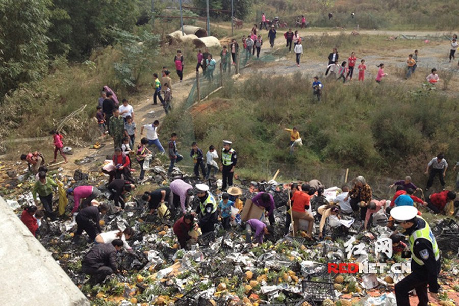 车主报警后,湖南高速交警宜凤大队抽调十余位民警现场维持秩序。在小规模哄抢被制止后,一些村民将消息传开,上百名村民涌入高速公路哄抢菠萝。民警现场制止,并警告哄抢货物是违法行为,情节严重还将涉嫌犯罪,但仍挡不住源源不断赶来的村民。居民拿篓子、桶子、麻袋等不停的来回哄抢菠萝,其中老人和小孩占绝大多数。