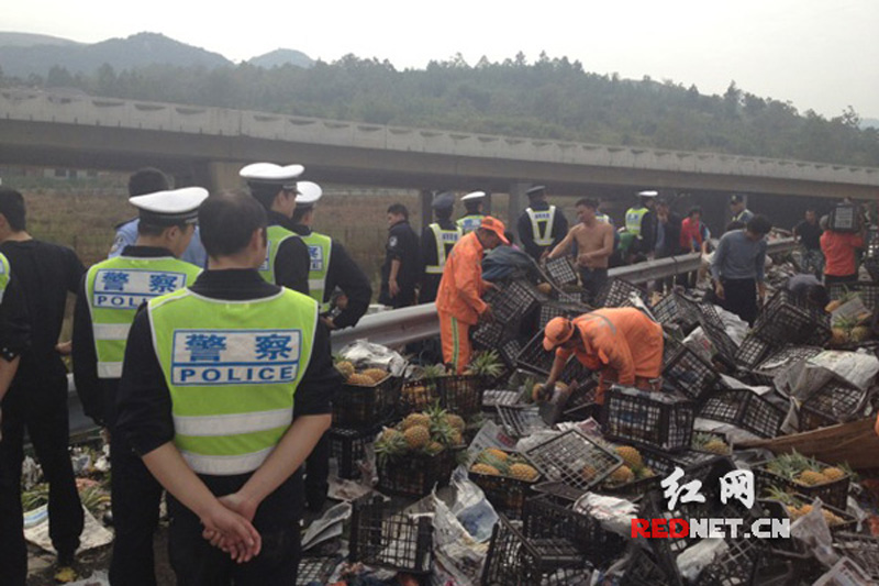 大货车侧翻匝道 20吨菠萝遭附近上百村民哄抢