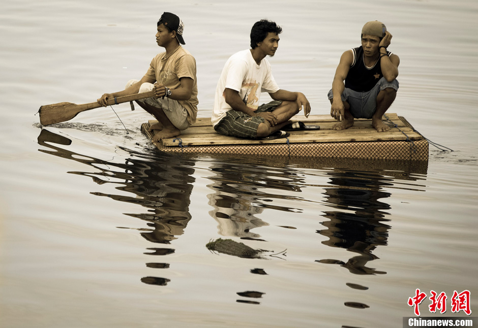 图为三位年轻人驶着竹筏漂在岛边的海中。中新社发 张浩 摄