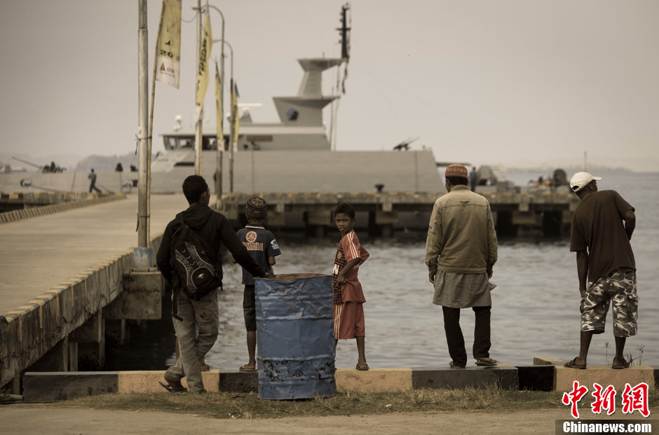 图为码头上的年轻人瞭望停靠在此的军舰。中新社发 张浩 摄
