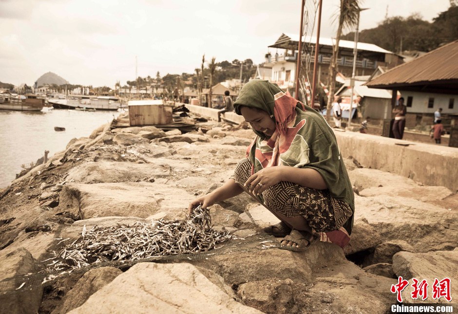 图为码头上一位女渔民在拾掇刚刚打捞上来的干鱼。中新社发 张浩 摄