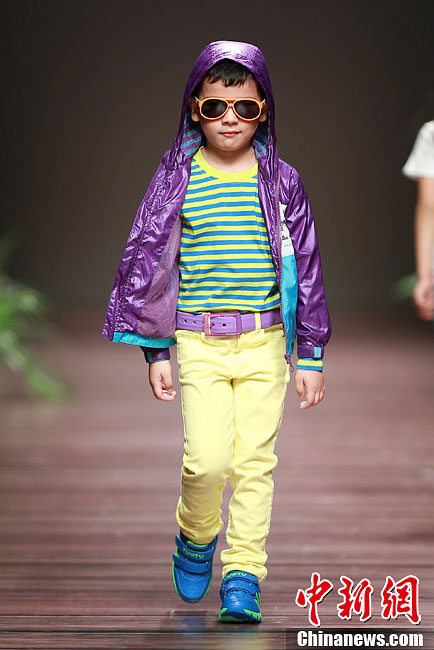 10月29日,小模特在北京举行的中国国际时装周(2014春夏系列)上图图童装,这是图图童装首次登上时装舞台。童装以“初爱”为设计主题,旨在用卡通元素与贴布印花绣花工艺的时尚混搭,亮丽清新的色彩交错搭配,营造自然舒适的氛围。中新社发 盛佳鹏 摄