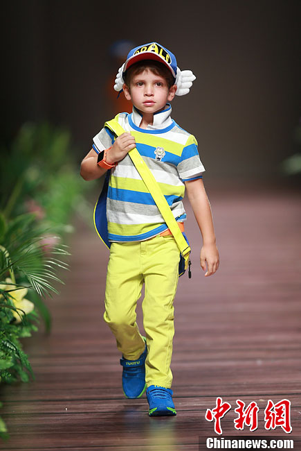 10月29日,小模特在北京举行的中国国际时装周(2014春夏系列)上图图童装,这是图图童装首次登上时装舞台。童装以“初爱”为设计主题,旨在用卡通元素与贴布印花绣花工艺的时尚混搭,亮丽清新的色彩交错搭配,营造自然舒适的氛围。中新社发 盛佳鹏 摄
