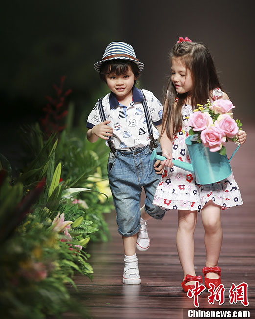 10月29日,小模特在北京举行的中国国际时装周(2014春夏系列)上图图童装,这是图图童装首次登上时装舞台。童装以“初爱”为设计主题,旨在用卡通元素与贴布印花绣花工艺的时尚混搭,亮丽清新的色彩交错搭配,营造自然舒适的氛围。中新社发 盛佳鹏 摄