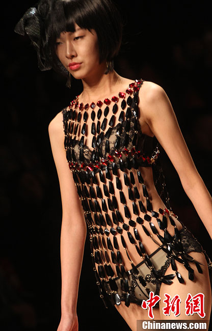 10月30日,正在北京举行的中国国际时装周(2014春夏系列)举行“欧迪芬”杯2013中国内衣设计大赛。本届大赛的20组作品从千余份作品中脱颖而出,主题为“绿色时尚”。图为模特展示欧迪芬中国内衣设计大赛作品。中新社发 钱兴强 摄