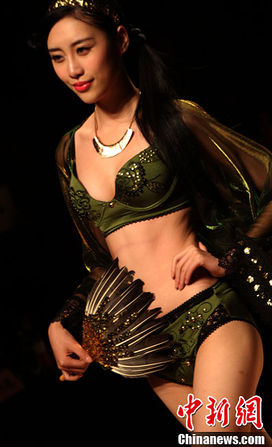 10月30日,正在北京举行的中国国际时装周(2014春夏系列)举行“欧迪芬”杯2013中国内衣设计大赛。本届大赛的20组作品从千余份作品中脱颖而出,主题为“绿色时尚”。图为模特展示欧迪芬中国内衣设计大赛作品。中新社发 钱兴强 摄