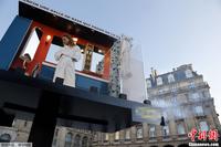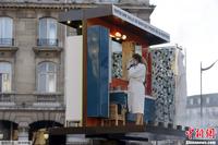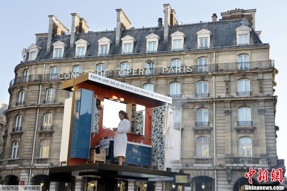 巴黎街头上演真人版浴室广告 女演员穿浴袍上阵