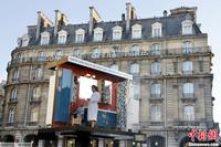 当地时间10月29日,法国巴黎圣拉扎尔车站前的广告牌上布置了一个“浴室”,一名女演员身着浴袍站在其中。