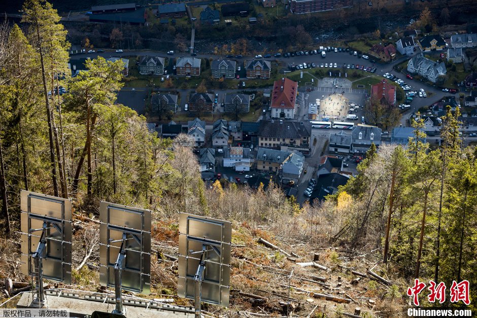当地时间10月30日,挪威中部小镇留坎的市民庆祝人造“太阳”正式落成。图为人造“太阳”由三面巨大的反光镜构成。