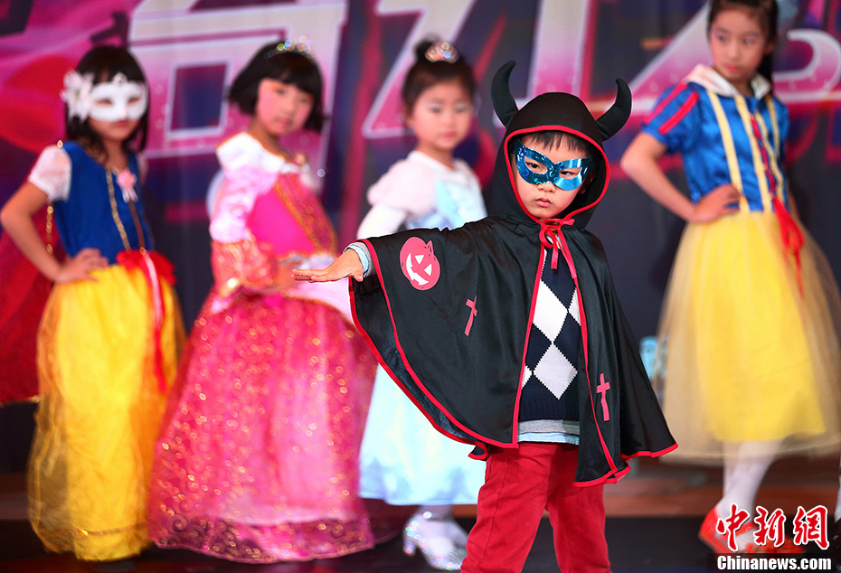 10月31日晚,一场少儿创意时装秀在南京上演,二十位三岁至十岁的孩子穿上各自独具“风格”的服装,在舞台上走起猫步来有模有样气场十足。中新社发 泱波 摄