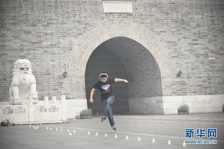 11月2日,一名轮滑爱好者在北京永定门练习轮滑。据北京市环境保护监测中心实时发布数据:11月2日清晨北京城六区“细颗粒物”污染指数为200-220,属重度污染,城区12个环境评价点全部为“五级”重度污染,其中丰台云岗、石景山古城、东城东四、海淀万柳、丰台花园5个环境评价点的空气质量指数均突破250。据预测当日天气将以多云间晴天为主,偏南风,对空气扩散不利。这也是北京市一周之内再度遭遇重霾。新华社记者 宋为伟 摄 图片来源:新华网