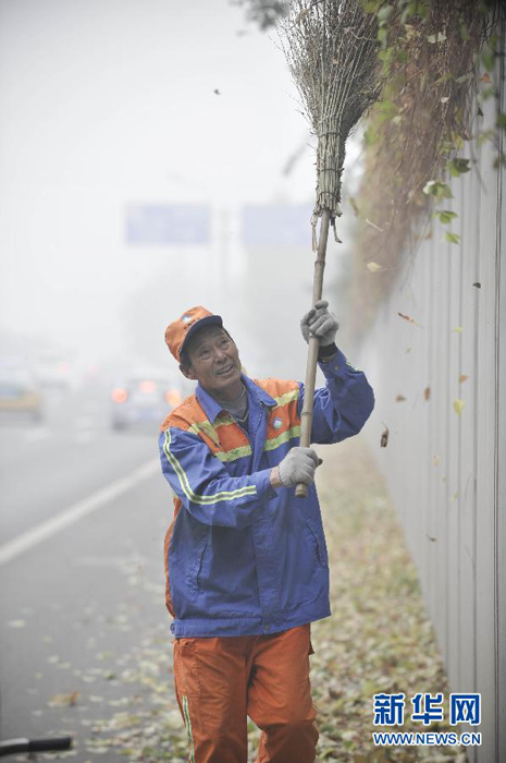 11月2日,环卫工人叶师傅在北京永定门桥下清扫落叶。新华社记者 宋为伟 摄 图片来源:新华网