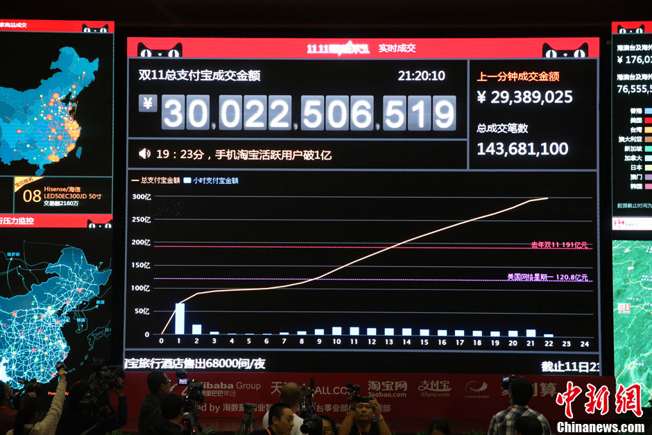 11月11日21时19分45秒,天猫“1111”购物狂欢节支付宝成交额突破300亿元,这相当于中国日均社会零售总额的4成。其中,手机淘宝的累计活跃用户达到1.13亿,支付宝交易金额达到45.8亿。图为杭州阿里巴巴西溪园区内的双十一天猫1111数据直播监控屏显示破300亿。中新社发 夏毅 摄