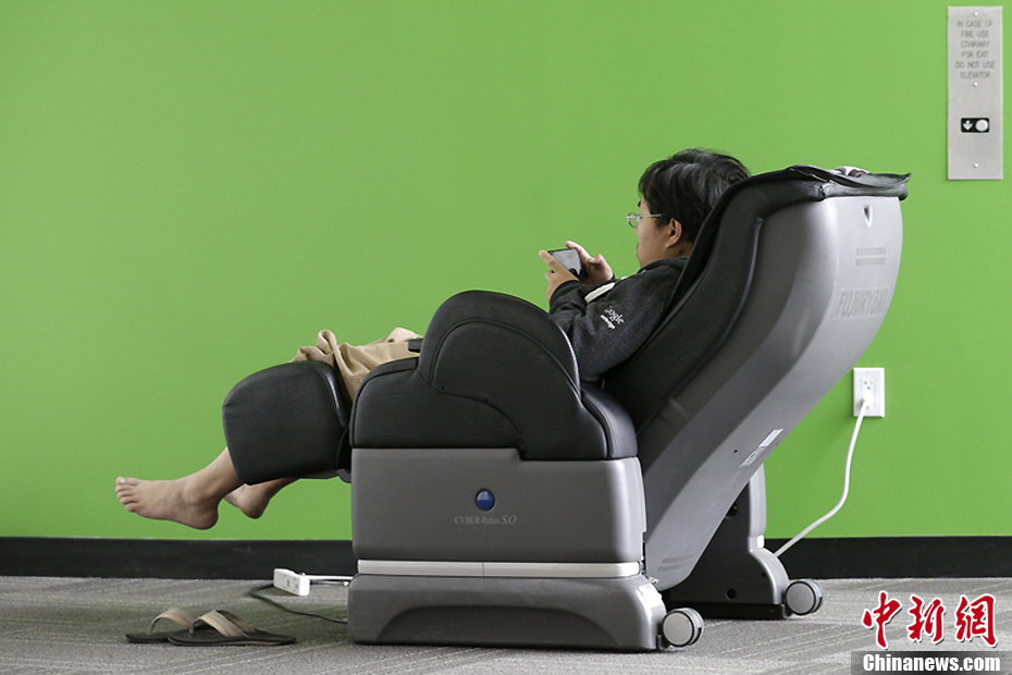 当地时间2013年3月15日,美国加州,谷歌办公室。软件工程师正在享受按摩椅的服务。图片来源:东方IC 版权作品 请勿转载