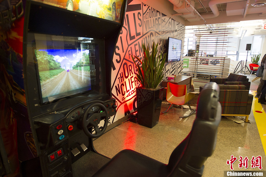 当地时间2012年11月13日,加拿大多伦多,谷歌向媒体敞开大门,向人们展示他们为员工提供的多姿多彩的休闲活动。员工休息时可以打电动赛车。图片来源:东方IC 版权作品 请勿转载