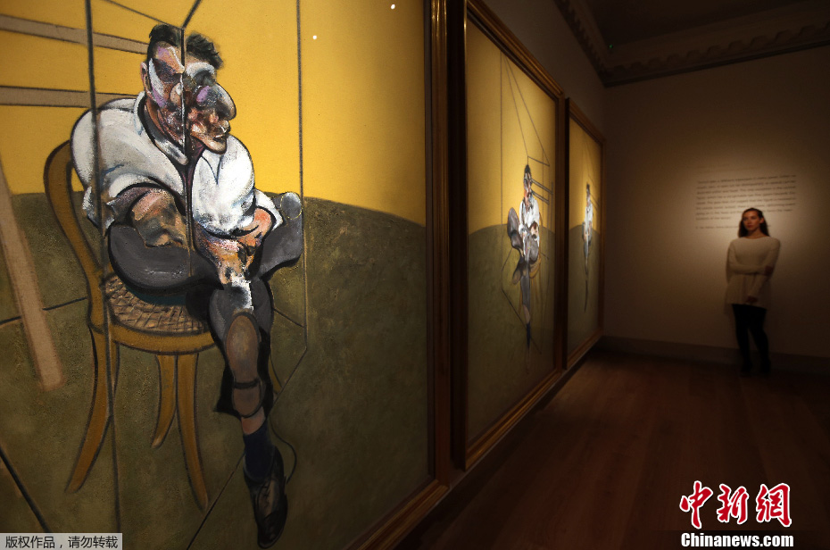 这幅培根在1969年创作的画作《弗洛伊德肖像画习作》(三联画)在纽约佳士得拍卖行最终以142405000美元落锤,这幅画作描绘的是培根的一位艺术家朋友。图为10月14日,该画作在拍卖前进行展览。
