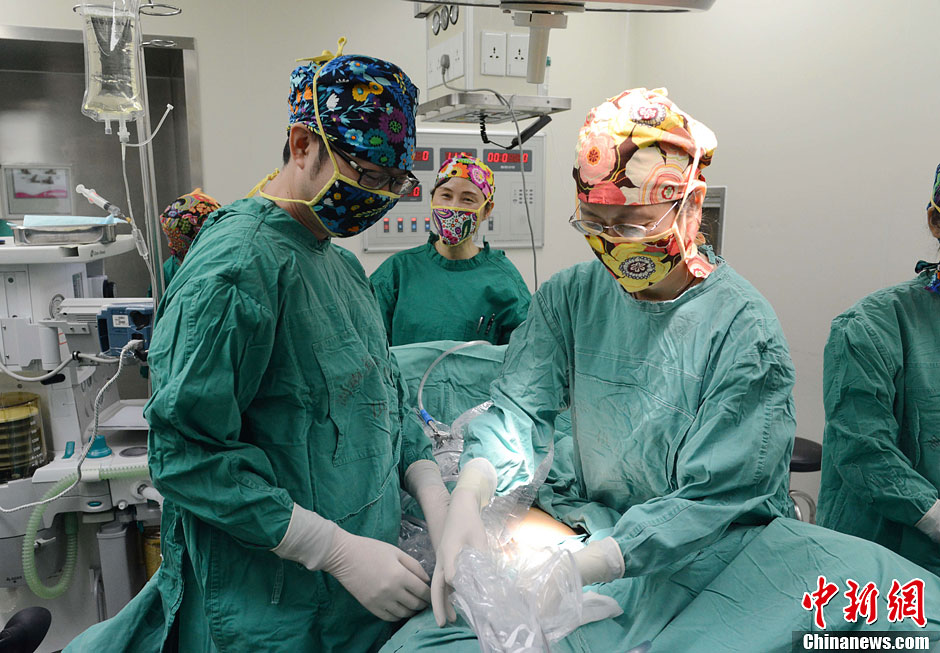 11月13日,湖南省妇幼保健院的医生和护士一改以往严肃形象,戴上了印着各式图案的花色手术帽为病人做手术。据该医院麻醉手术科主任李爱媛介绍,医生在人们的印象中特别严肃,往往会让人有种紧张感。通过改良手术帽,为冰冷的手术室增添一股暖色调,能拉近与患者的距离,令患者舒缓情绪、放松心情,减少患者对手术的恐惧感。中新社发 杨华峰 摄