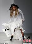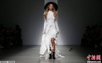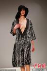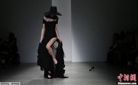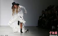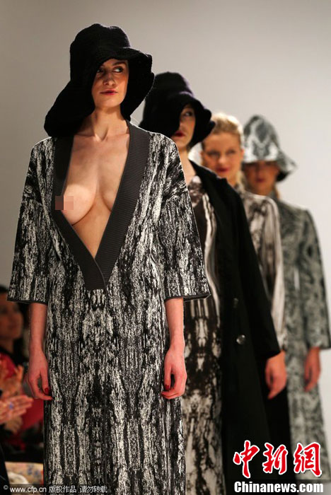 当地时间2月16日,伦敦2014秋冬时装周秀场,Apu Jan品牌专场秀。模特T台走秀不慎走光忙遮掩。图片来源:CFP视觉中国