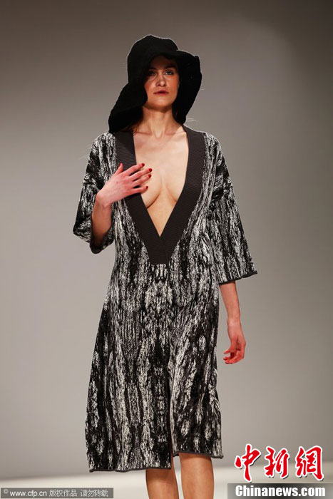 伦敦时装周模特深V走秀不慎走光忙遮掩