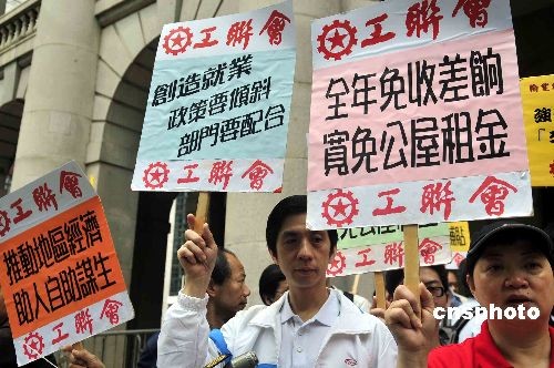 二月二十五日,香港多个团体趁特区财政司司长曾俊华向立法会提交二零零九至二零一零年度财政预算案之际,在立法会大楼前请愿,希望即将推出的财政预算案更加关注民生。中新社发 谭达明 摄