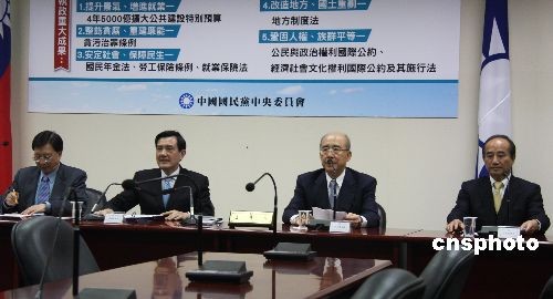 四月十日上午,台湾“立法院”院会三读通过被台湾“行政院”视为拯救经济药方的二00九年度振兴经济扩大公共建设特别预算案,总经费达新台币一千四百九十一亿元。为此在马英九的提议下,中国国民党在中央党部召开“史无前例的记者会”,领导人马英九(左二)、国民党主席吴伯雄(右二)、“立法院”院长王金平(右一)、“行政院”院长刘兆玄(左一)共同面对媒体,表达团结一致拼经济的决心。中新社发 耿军 摄