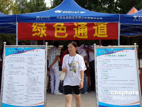 9月7日,湖北民族学院为汶川大地震开辟的新生绿色通道正式运行。据了解,该校免除了来自四川、甘肃地震灾区学生在校期间所有学费和住宿费,直接通过“绿色通道”入校。该校共录取了柏彦军龚靖杰等21名自四川、甘肃等震区的受灾学生。中新社发 何光 摄