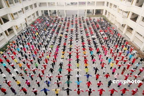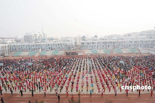 2009年2月6日,江苏省赣榆县外国语学校万名师生在校园大操场做广播体操。当日,该县20万中小学生结束寒假,开始新学期的学习。中新社发 司伟 摄
