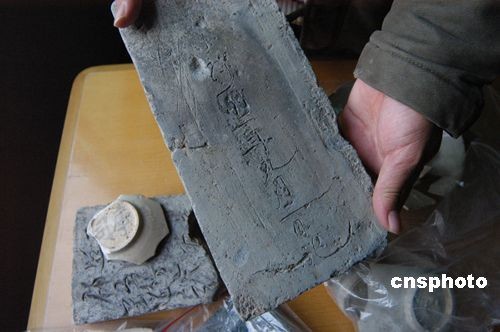 经过近半年的考古勘探与发掘,一座占地约22000平方米的大型宋代造纸作坊遗址近日在杭州富阳市高桥镇泗洲村露出全貌。经国家文物局专家组认定,富阳泗洲宋代造纸遗址是中国迄今为止发现的年代最早、规模最大、工艺流程保存最完整的造纸作坊遗址。图为从宋代造纸遗址出土的宋代方砖。中新社发 骆晓飞 摄