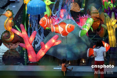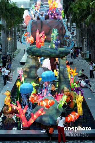 九月九日傍晚,香港文化中心广场的“缤纷水世界”中秋彩灯璀璨耀目,吸引许多游客和市民观赏。由香港康文署举办的“戍子年中秋彩灯会”于即日起至十月十二日与市民共贺佳节。中新社发 洪少葵 摄