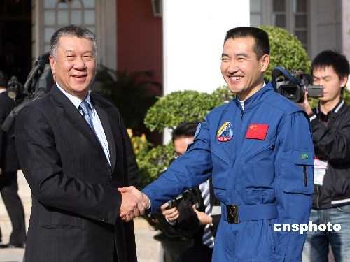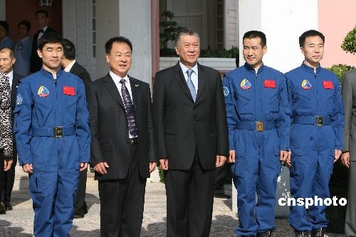 十二月十日,“神舟七号” 载人航天飞行代表团一行向澳门特首何厚铧辞行,结束澳门访问行程。中新社发 武仲林 摄