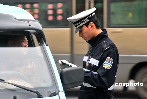 2009年2月25日,湖南郴州交警支队民警在街头路口查处纠正各类交通违章行为。连日来,全国各地公安交通管理部门纷纷开展交通违法行为集中整治,为全国“两会”的召开创造良好交通环境。中新社发 贺茂峰 摄