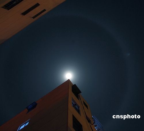 2009年3月6日21时起,山东枣庄天空出现罕见的月晕天象,甚为壮观。据悉,月晕的形成是因为天空中有一层高云,月光透过云中的冰晶时发生折射和反射,在月亮周围形成彩色光环。民间有“日晕三更雨,月晕午时风”的说法。 中新社发 刘明祥 摄