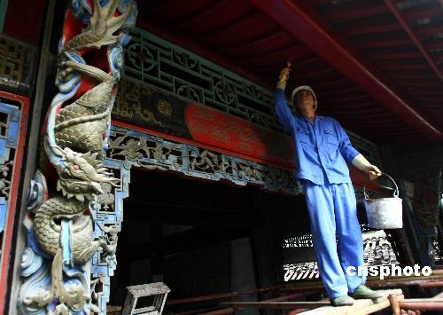 5月6日,文物修缮人员正在对四川省都江堰伏龙观进行加固修复,该观在去年5.12地震中受损严重。伏龙观为道教宫观,传说李冰父子治水时曾制服岷江孽龙,将其锁于离堆下伏龙潭中,后人依此立祠祭祀。伏龙观预计将于今年年底修缮完工并重新迎客。中新社发 富田 摄