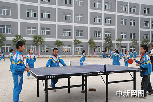 5月12日,深圳援建的文县碧口小学操场上,孩子们在课余时间跳绳、打球尽情玩耍。经过一年的艰苦努力,今天,终于让1200多名学生告别板房,搬进校舍,恢复正常上课。司小平 摄