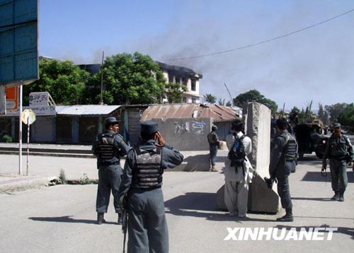 5月12日,在阿富汗东部霍斯特省,阿富汗安全人员在街头警戒。自12日上午起,塔利班武装人员连续在霍斯特发起多次自杀式爆炸袭击。13日上午针对当地美军军营的一次自杀式汽车炸弹袭击造成7人死亡、21人受伤。