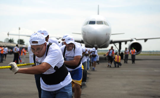 5月24日,在萨尔瓦多首都圣萨尔瓦多以南40公里处的国际机场,20队选手参加了在此举行的拖飞机比赛,他们要在5分钟内将一架空客A320飞机拖动25米的距离。