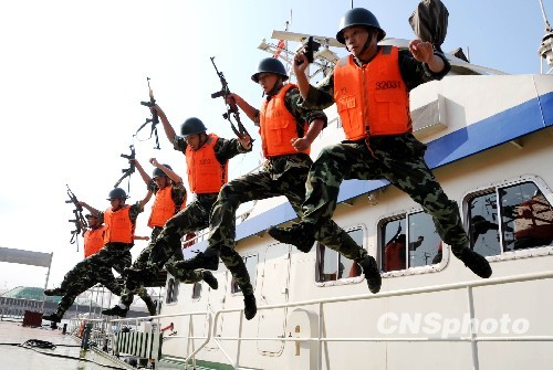 7月29日,江苏边防总队连云港海警大队掀起了夏季海上处突大练兵活动。通过海上巡逻、快速出击、海上搜捕等各类恐怖暴力事件模拟演练,打造实战背景下的应急处突能力。中新社发 王春 摄