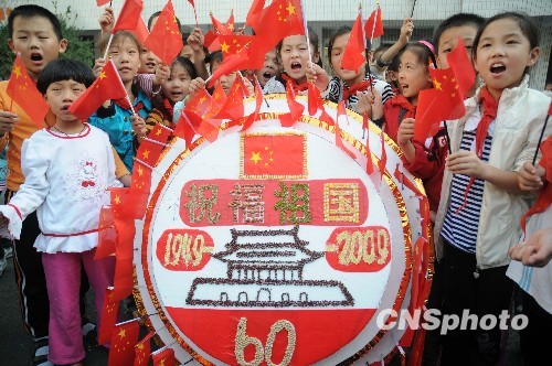 9月27日,河南省南阳市第四小学的学生用花生、玉米、黄豆等十多种粮食种子和废弃的泡沫板,为祖国母亲制作了一个巨大的生日蛋糕,预祝祖国母亲60华诞五谷丰登。