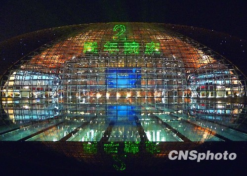 12月20日晚,北京国家大剧院有关人员正在调试“2周年院庆”激光字幕,准备迎接12月22日国家大剧院两周年院庆的到来。 中新社发 玉龙 摄