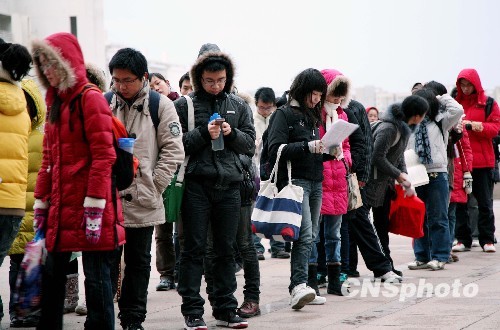 大学学子图书馆前排队复习迎考。中新社发 钟山 摄