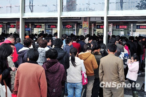 1月30日,一年一度的春运开始,福州火车站购票大厅迎来了购票高峰,购票旅客排起的长龙延伸到了购票大厅外。中新社发 张丽君 摄