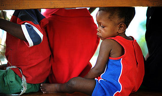1月31日,一名被拐卖的儿童(右)获救后坐在海地首都太子港附近的国际SOS儿童村。