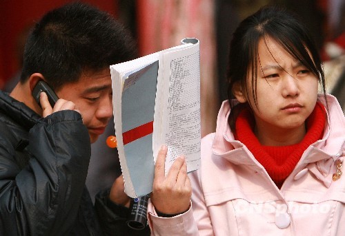 2月22日,考场外一名考生边吃棒棒糖,边打电话,边看招生资料。中新社发 张学军 摄