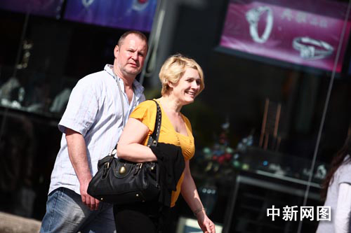 身着夏装在成都春熙路逛街的老外。张浪 摄