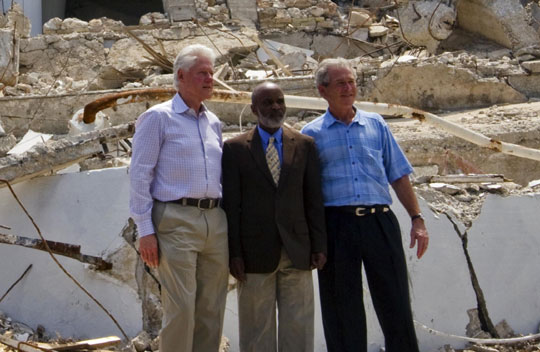 3月22日,美国前总统小布什和克林顿访问海地并在太子港总统府与海地总统普雷瓦尔出席新闻发布会。
