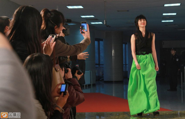 孙燕姿拖地绿裙亮相显优雅 脚底拌蒜险摔倒