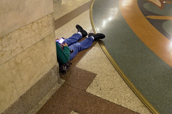 下午交通高峰期,中央车站玩手机消磨时间的乘客。