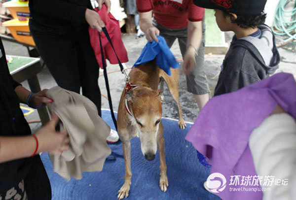 灰狗的饲养员在拿干燥的毛巾擦拭赛狗。