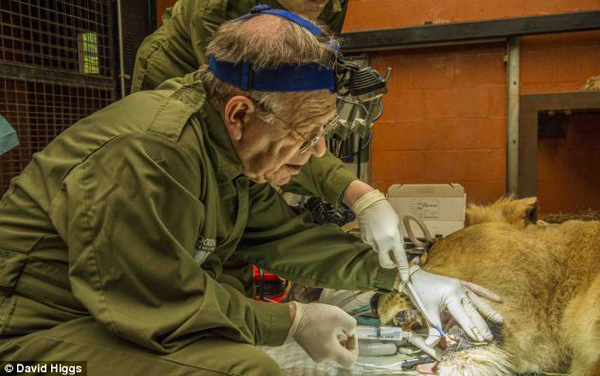手术人员先用飞镖枪给母狮注射镇静剂,等母狮失去意识后,将一根导管伸入母狮的喉部为它输氧和注射麻醉气体,使它可以在整个手术过程中保持睡眠状态且免受痛苦。彼得医生用电池钻撬开母狮感染的牙齿根管,另一名手术人员用冷水冲洗根管内的感染物。整个手术持续了1小时45分钟,术后母狮恢复良好,没有出现并发症,已开始进食。