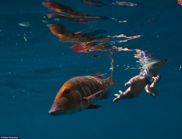 图为大堡礁赫伦岛海域,一条红喉皇帝鱼被放归野外。照片中,人工手术留下的伤疤和安装的声学标签依稀可见。摄影师Dave Abdo。